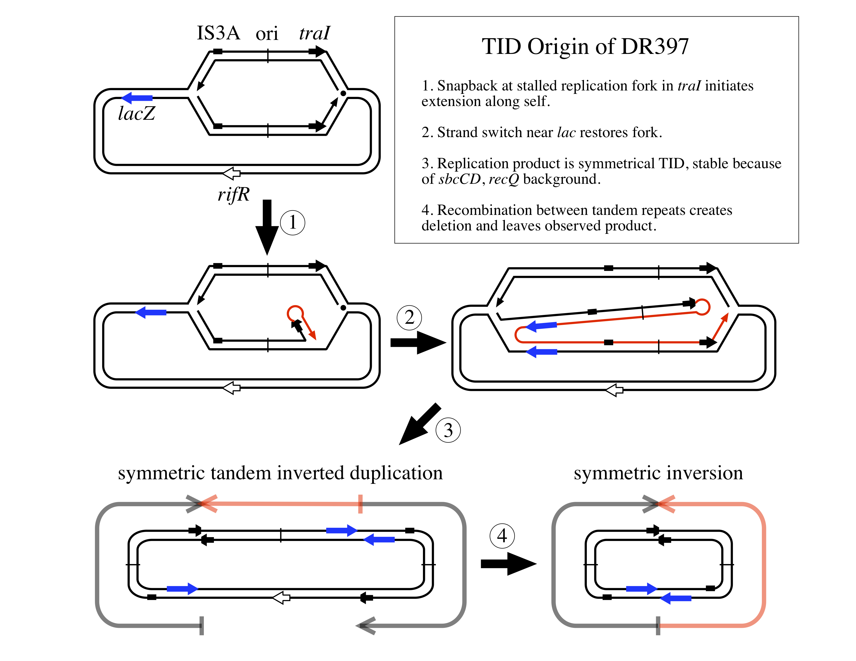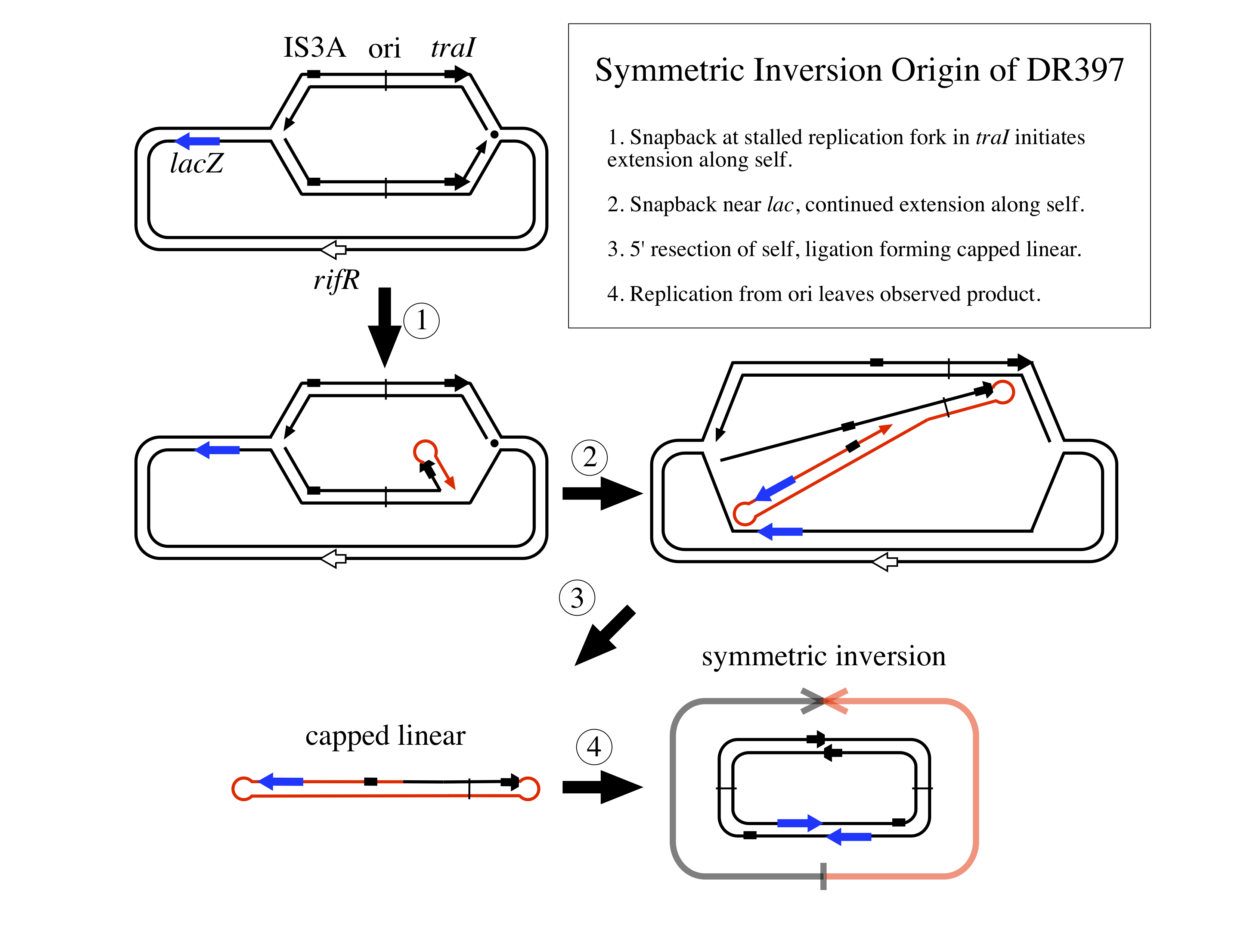 Model 1: A snapback at traI followed by another at lac, 5′ resection and ligation of ends will produce a product that matches our observations. It would look something like the following: