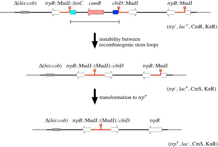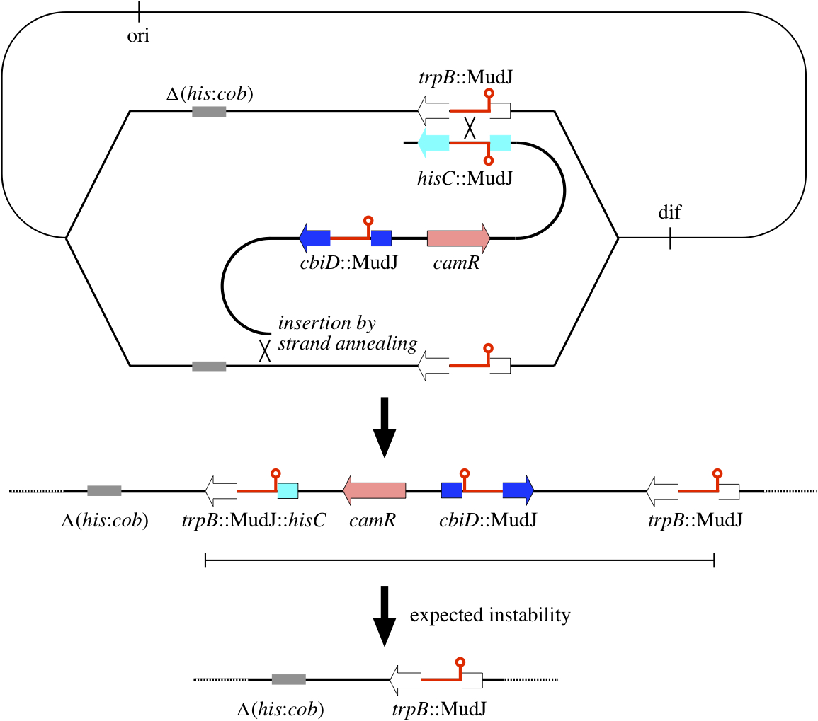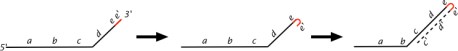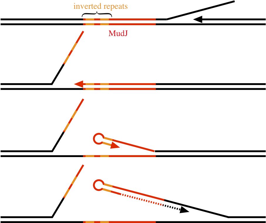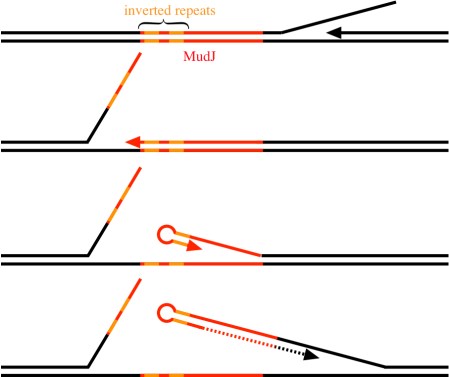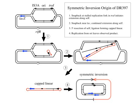 Other related models are possible, with the order of the snapbacks and strand switches reversed, with double strand switches instead of snapbacks, etc. Nevertheless, we favor the second model above, as it only involves two steps to get the essential intermediate, while many generations can pass before selection of the final product.