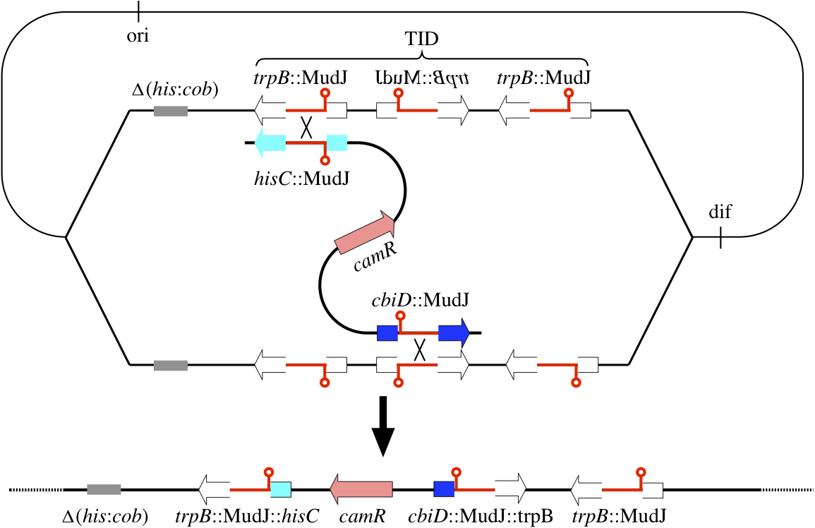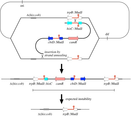 An interesting aspect of the TID model is the inevitability of the remodeling event. When the origin is itself in the TID, counterselection on a large number of unnecessary genes leads easily to their deletion by recombination. The resulting fitness increase will lead to expansion in the population of the symmetric inversion and eventual extinction of the TID.