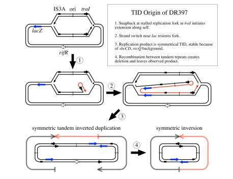 We think TID formation often begins with a snap-back of a 3′ end at a short inverted repeat, forming a stem-loop structure which then initiates DNA synthesis using self as template.